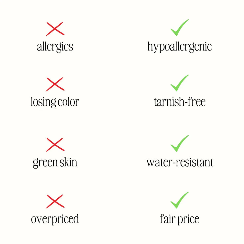 High-quality stainless steel with 18K gold plating, crafted to be waterproof and tarnish-resistant.